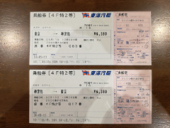東海汽船の窓口で乗船券を受け取ります。往復とも神津島までの大型客船(さるびあ丸)を予約しています。
