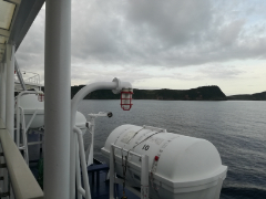 展望デッキに出るともう大島が近くに見えています。早朝の風はやや冷たいです。長袖を選んで正解でした。