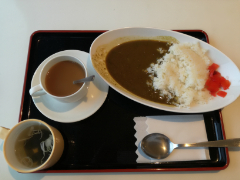 利島に着く頃、レストランが開きます。海を眺めながら明日葉カレー、わかめスープ、コーヒーをいただきます。