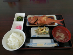 よっちゃーれセンターで金目鯛の煮付け定食をいただきます。明日葉の天ぷらもついています。豪華です。