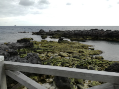 赤い岩が海へとのびています。なるほど赤崎という名が付くわけです。下へ降りてみると、濡れた岩場をフナムシたちが歩いています。生で見ると意外に(?)かわいいです。