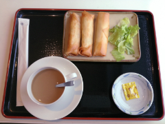 レストランでコーヒーと特製春巻きをいただきます。辛子がよく合います。