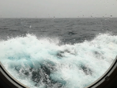 遠目にも船が前後に揺れているのがわかります。たったひとり荒波を越えてきます。