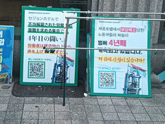 明洞の道沿いに、不当解雇に抗議する集会の看板がありました。驚いたことに日本語の看板が並んでいます。