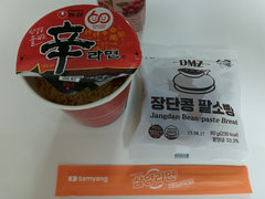 コンビニで辛ラーメンを買ってホテルに帰り、夕食とします。割りばしの袋に印刷されているのがライバルの三養ラーメンなのが面白いポイント。